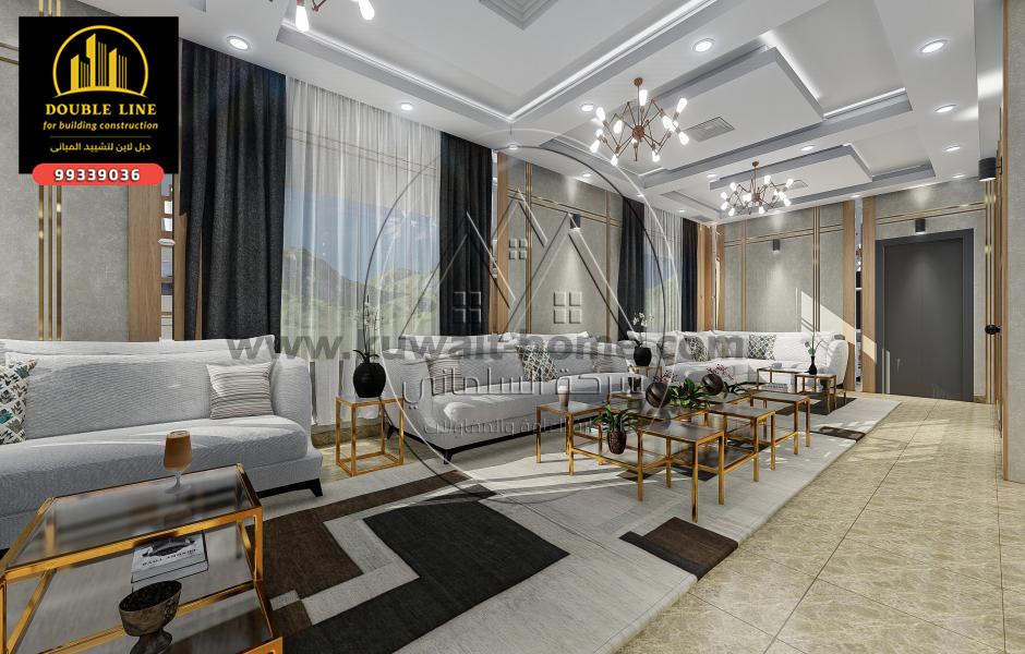 شركة دبل لاين لتشييد المباني 99339036 تشطيب صاله استقبال بمنطقه ام الهيمان عباره عن ديكورات جبس وجبس بورد واخشاب والحوائط مع الإضاءات المخفيه والاصباغ الايطاليه