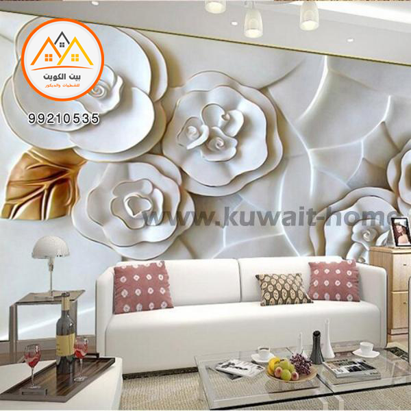 شركة دبل لاين لتشييد المباني 99339036 بعض التصميمات الداخلية الهادئه والتى تعتمد ورق الحائط باشكال الازهار الثلاثية الابعاد 3d كعنصر اساسى فى التصميم مع مراعاة الالوان المطلوبة وملائمتها للاثاث والديكور