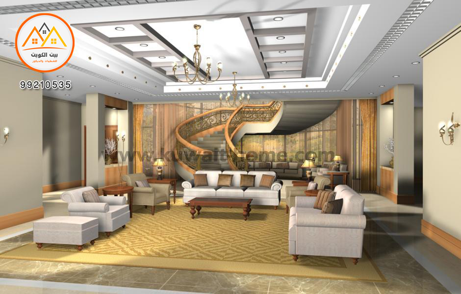 تصميم صاله معيشه بشكل احترافي مع وجود روف فوق الصاله معتمدا علي الديكور والخلفيات بالحوائط ليكون السلم المؤدي للروف مقبول شكلا وتصميما ويعطي حجم للصاله اوسع ولا يمكن الاستغناء عنه وربطه بالصاله بشكل جمالي ذو احترافيه في التصميم شركة دبل لاين لتشييد المباني 99339036