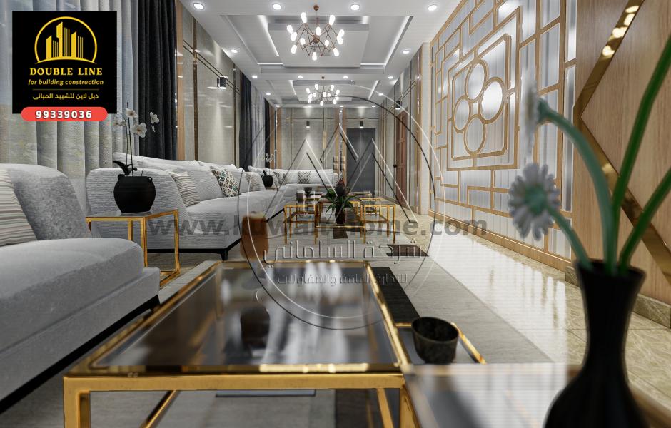 شركة دبل لاين لتشييد المباني 99339036 تشطيب صاله استقبال بمنطقه ام الهيمان عباره عن ديكورات جبس وجبس بورد واخشاب والحوائط مع الإضاءات المخفيه والاصباغ الايطاليه